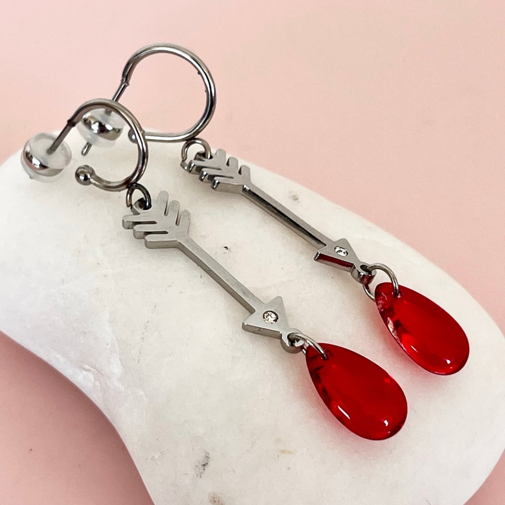 Stainless steel half hoops with an arrow charm and red glass droplet. Size of hoops 11.5mm. Length of charm and droplet 43mm.Comes in a cute gift bag.
