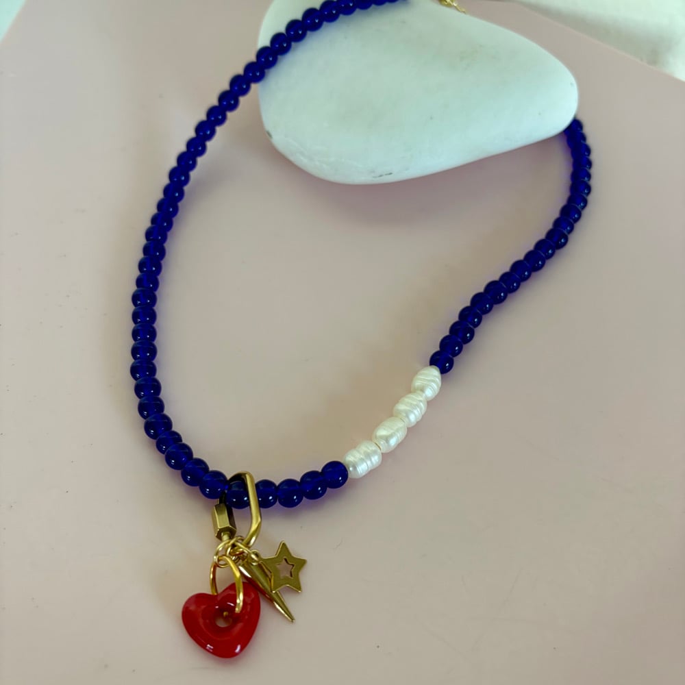 A hand beaded statement necklace featuring blue glass beads (6mm) and freshwater pearls with an oval carabiner (21x11mm 18k gold plated stainless steel). This can be opened so you can take off the charms or add your own. On the carabiner is an red glass heart (15mm) a spike and star charm. Length of necklace approx 42cm plus an extender. Comes in a cute box.