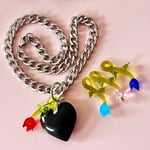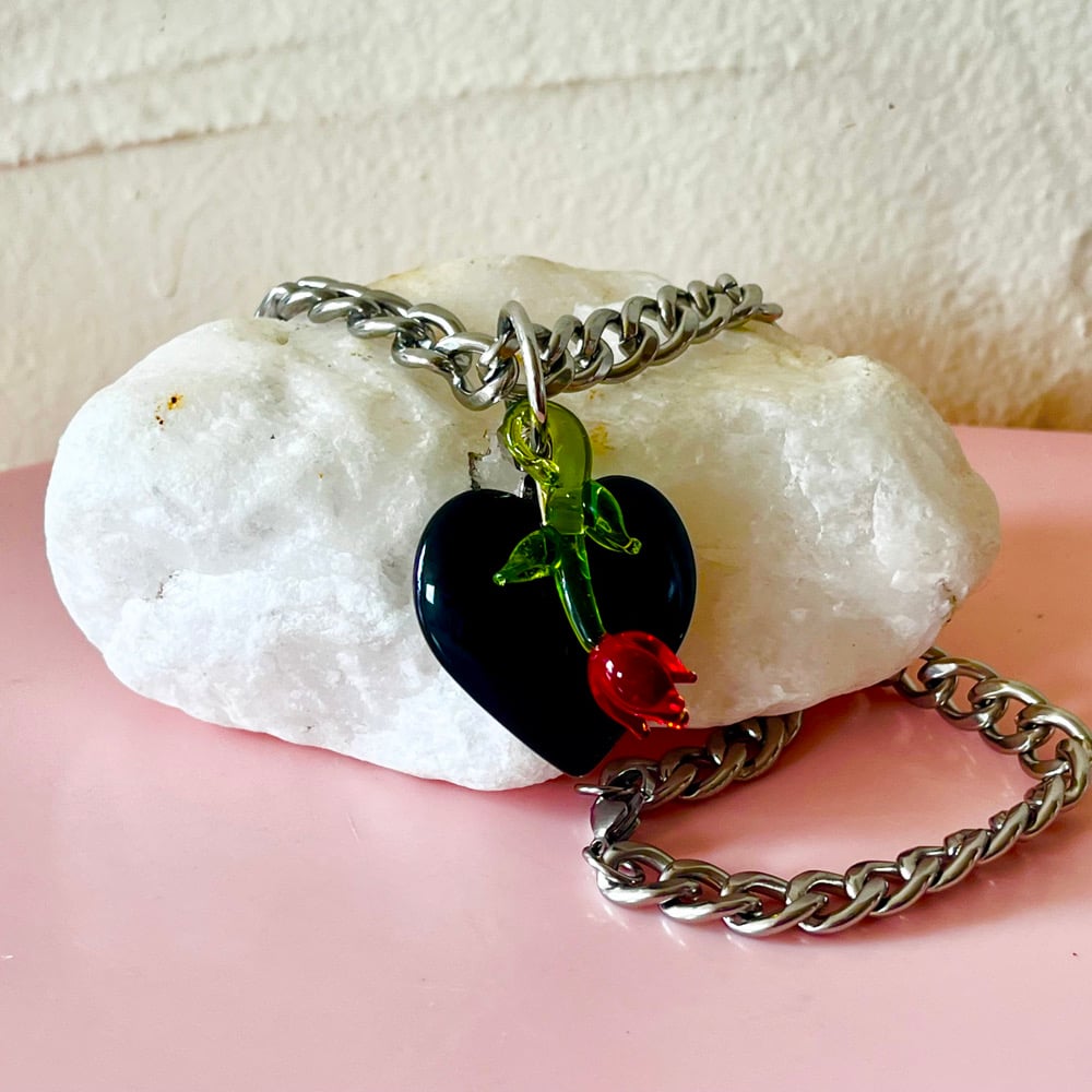 A big chunky statement necklace featuring a big black glass heart (39mm) and a glass rose (45mm long) on a circular carabiner - this can be opened so you can take off the charm or add your own. I have a few options of colours in the rose - pick which you like the best! The chunky cuban style stainless steel chain has links that are 13x9x4mm and the length of the chain is 45cm. Comes in a cute box.