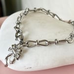 A stainless bracelet with bow shaped links and a stainless steel bow charm. Bracelet measures 19.7cm. Comes in a cute gift bag.