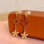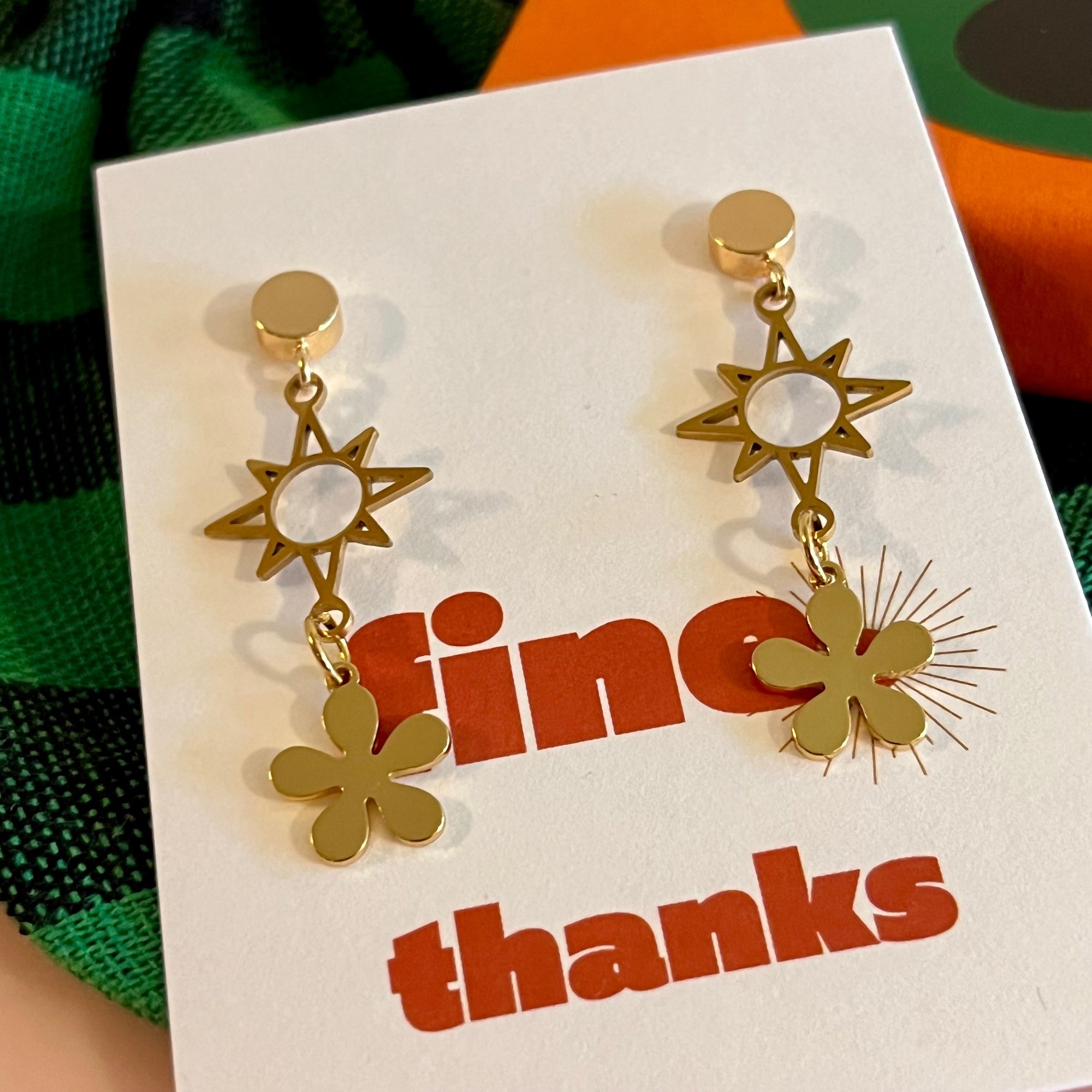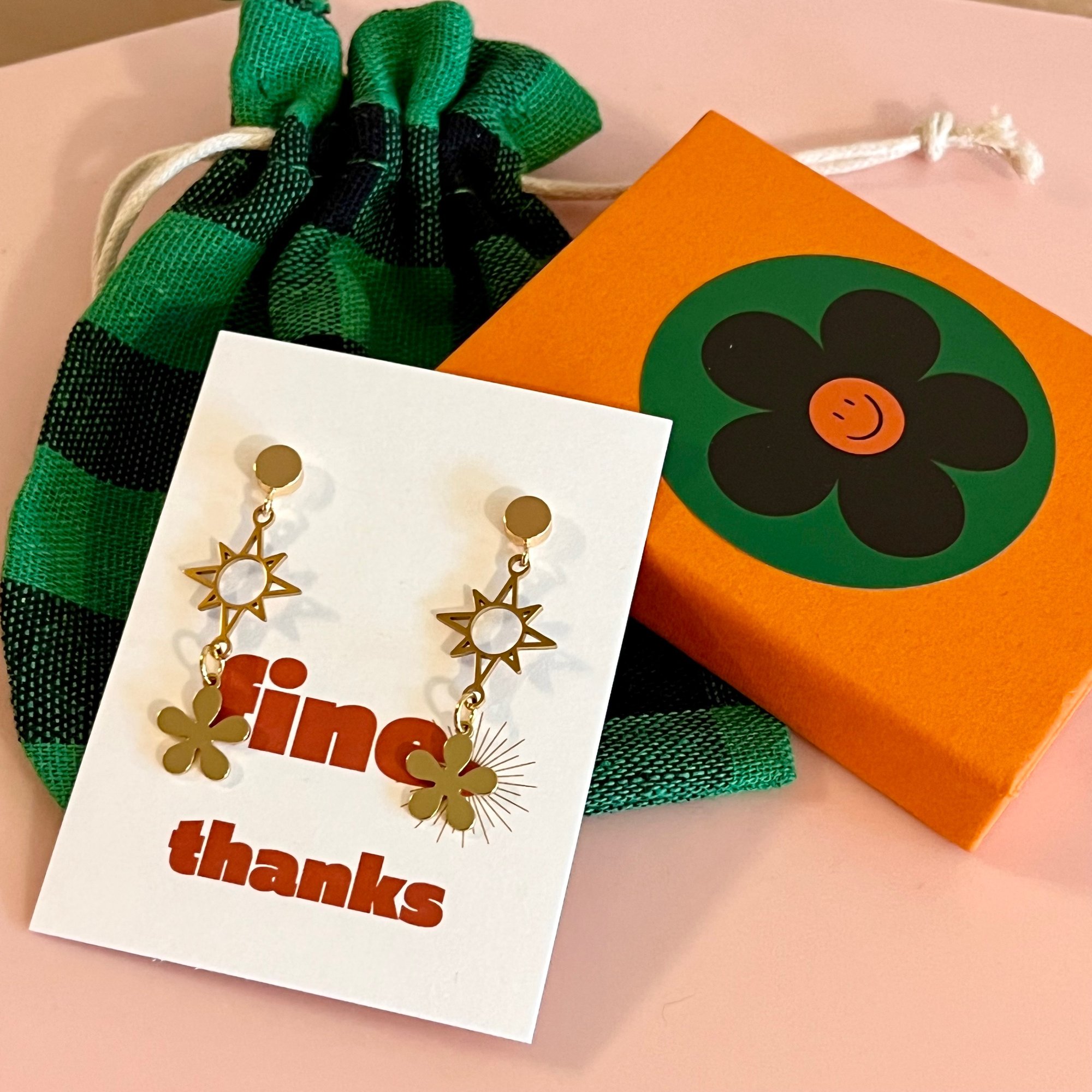 Part of the Fine Thanks range - this fun pair features a gold plated sun connector (15x18mm) and an 18k gold plated daisy charm (10mm) on an 18k gold plated brass circle ear stud. Size of drop 42mm. Comes in a cute box and gift bag.