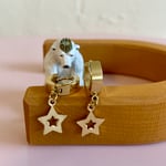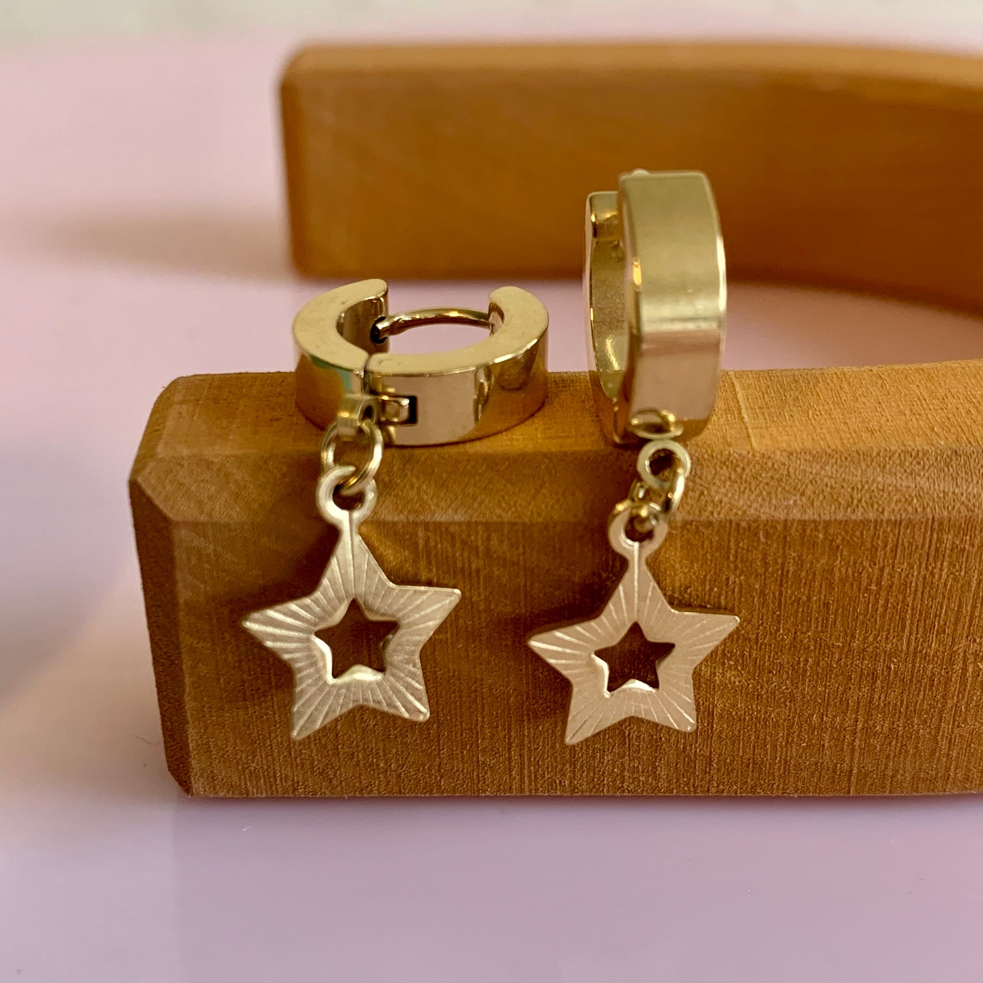 Stainless steel gold plated huggie hoops with a hanging star charm. Size of earring 13mm. Size of star 13mm. Comes in a cute gift box.
