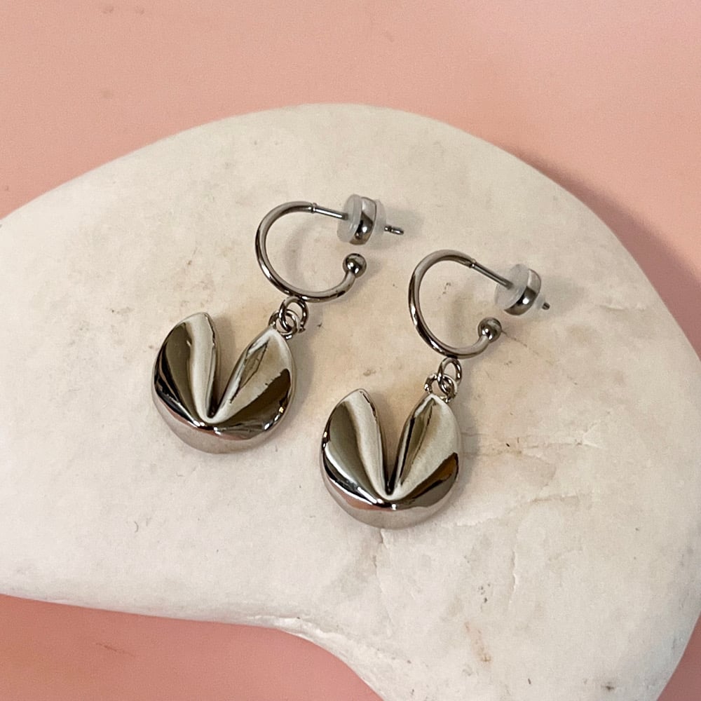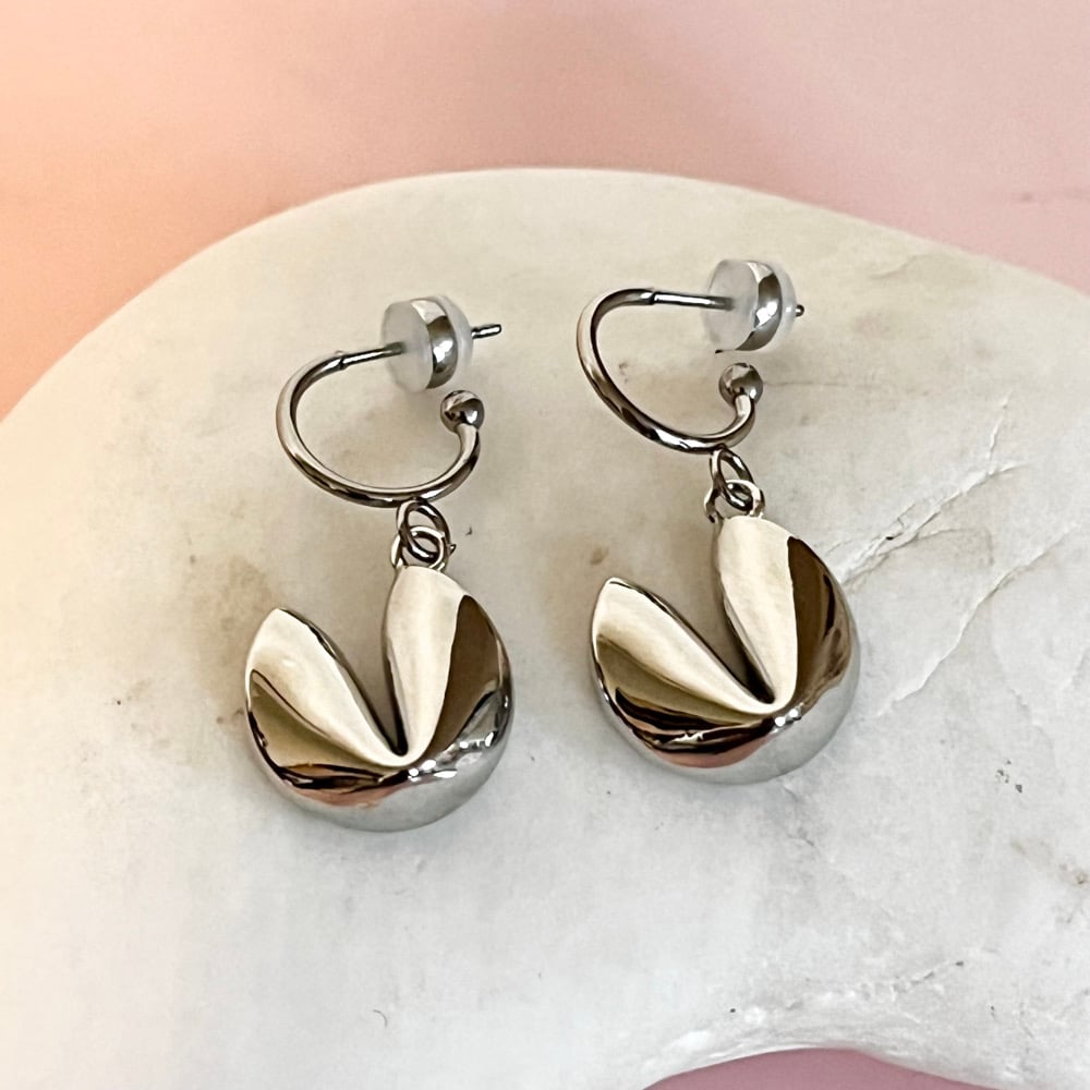 Stainless Steel half hoops with a stainless steel fortune cookie charm. Size of hoops 11.5mm and charm 17mm. Comes in a cute gift bag.