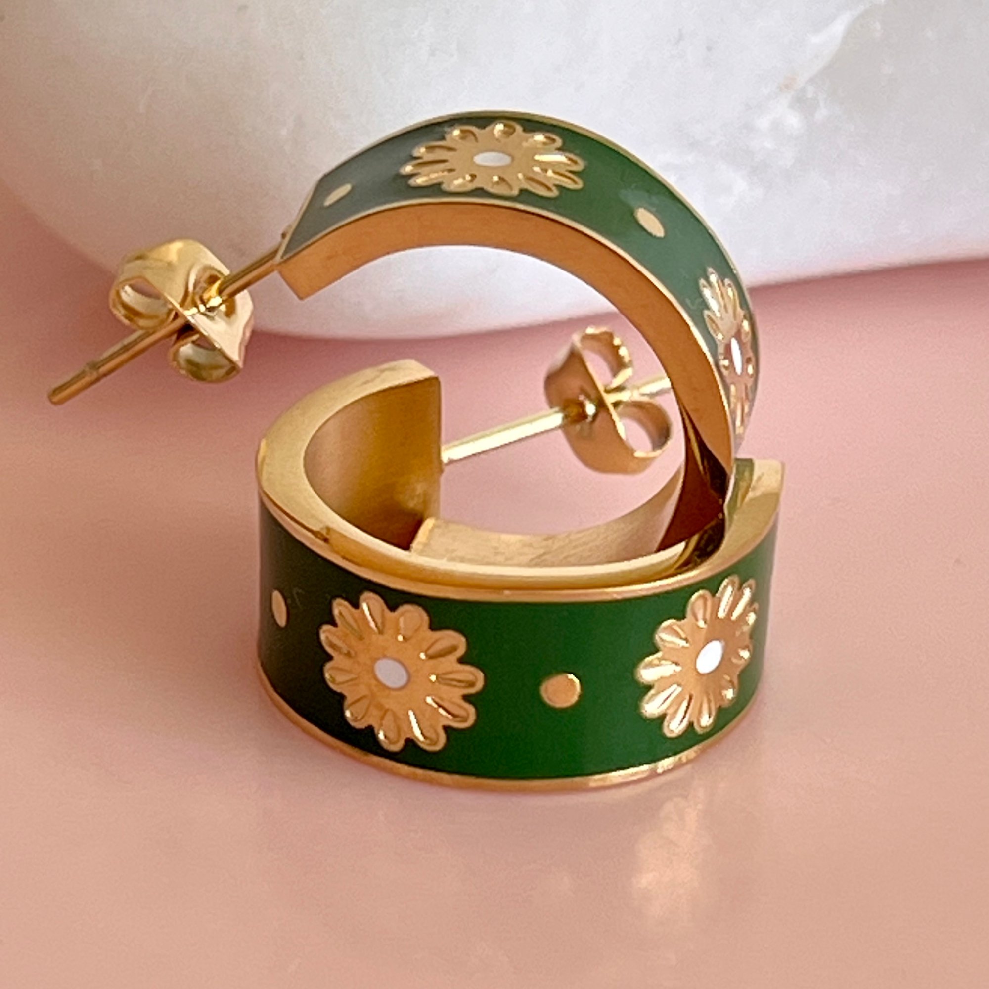 The cutest enamel flower pattern! Gold plated stainless steel and enamel hoops that measure 18x18mm. Comes in a cute gift bag.