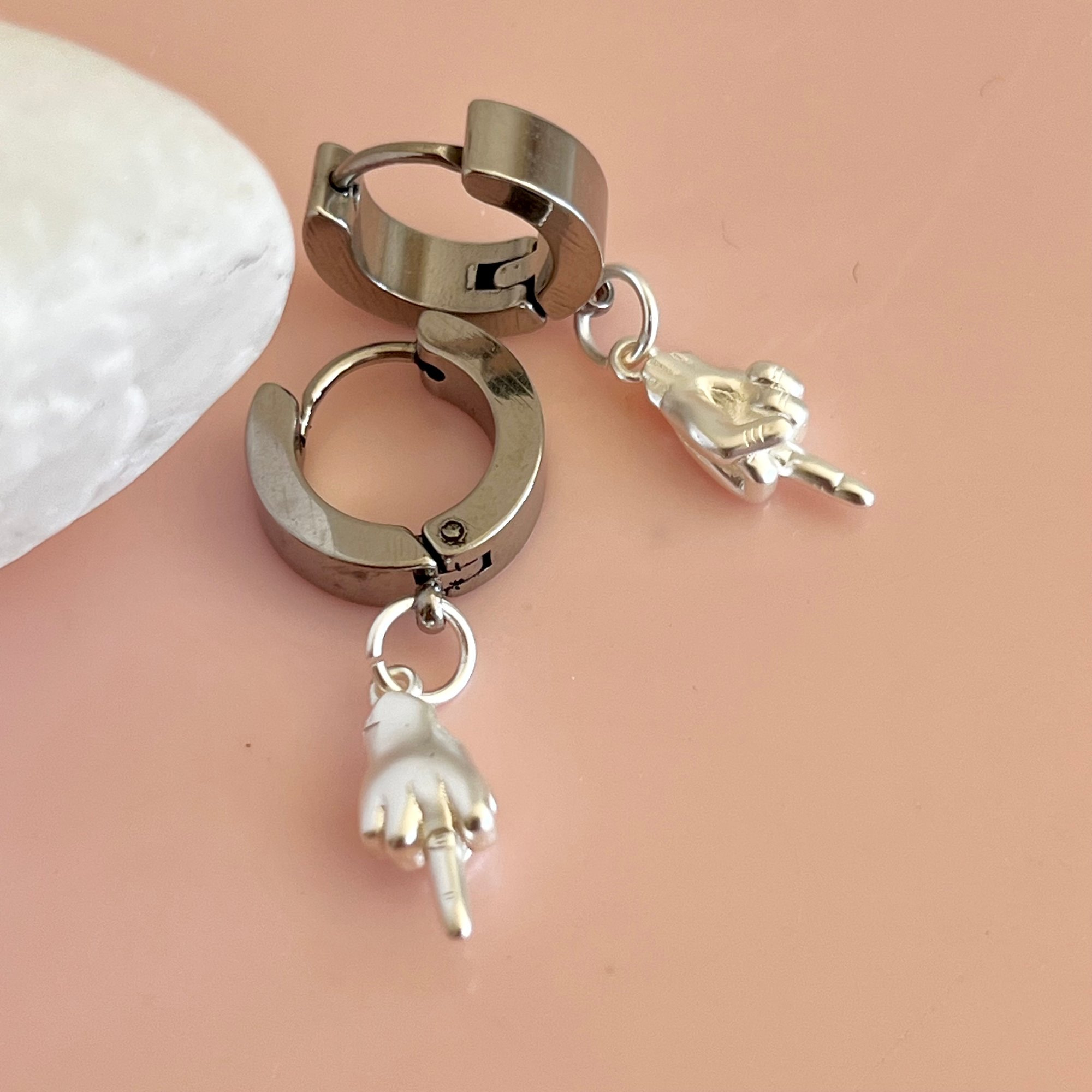 Stainless steel Huggies hoops with a light stainless hand charm. Size of earring 13mm and charm 6x14mm. Comes in a cute gift bag.