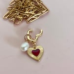 A gold plated brass heart charm with red glass and a little pearl on a stainless steel gold plated paperclip chain. These are linked with an oval connector that opens to allow you to change the charms. Chain links are 11x4mm and is a length of 48cm. Heart measures 16.5x13mm and pearl 11mm.