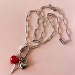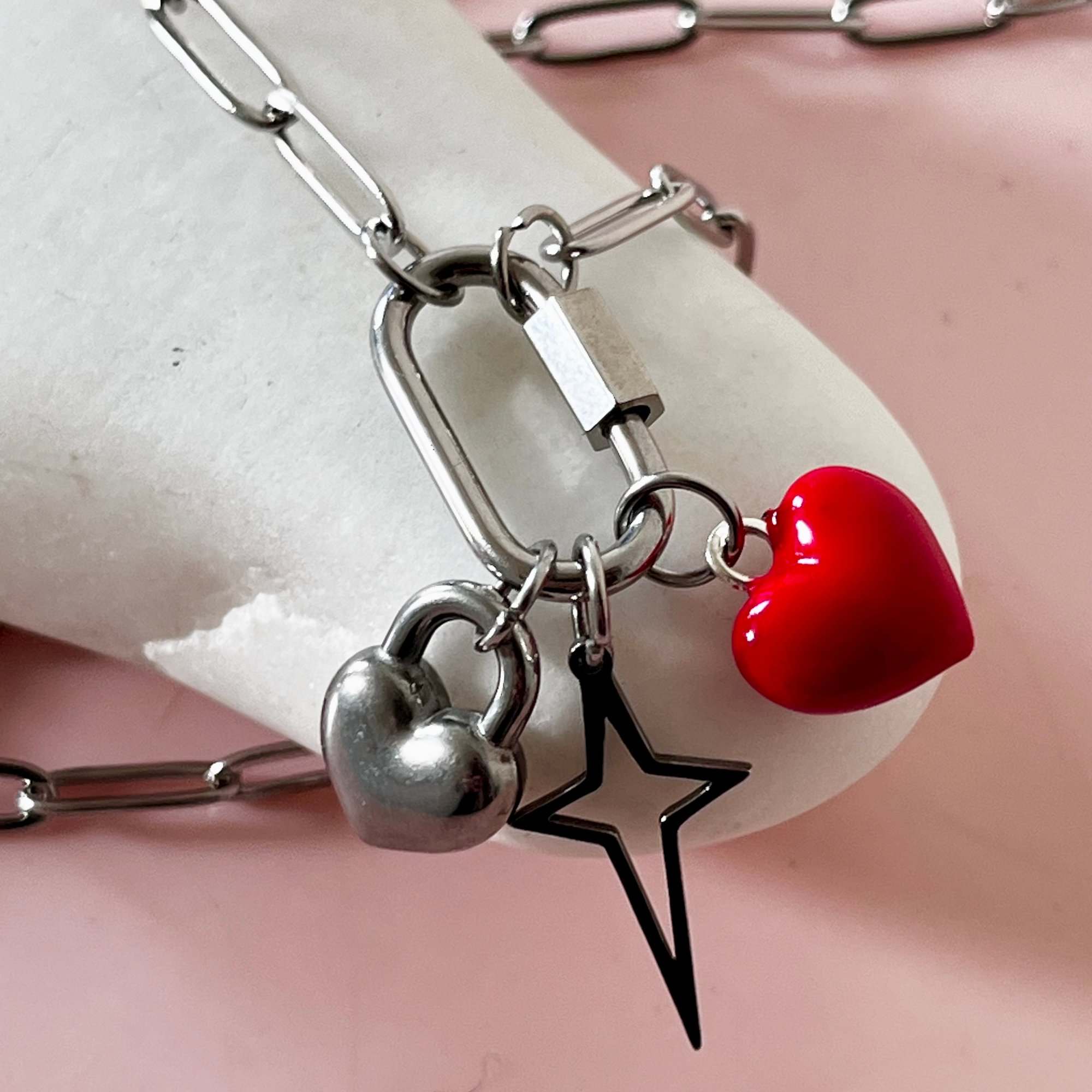 A stainless steel paperclip chain necklace with a carabiner lock and three charms including a stainless steel heart lock (15.5x11mm), a red enamel puffy heart(13x12.5) and a long star (21.5x11.5mm). The carabiner lock unscrews and allows you to mix and match charms. Length of necklace 45cm. Comes in a cute gift bag.