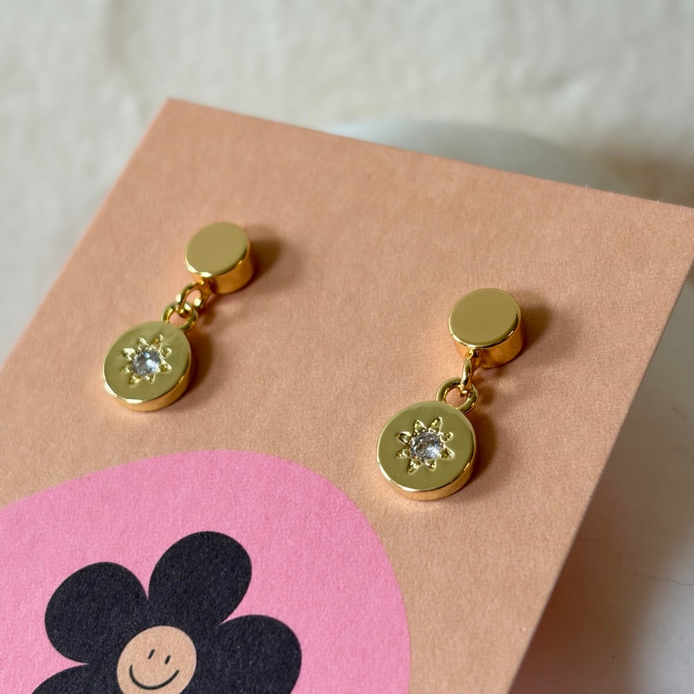 18k gold plated half circular stud with a 18k gold plated brass circle charm with a cubic zirconia star. Size of charm 11x8mm.