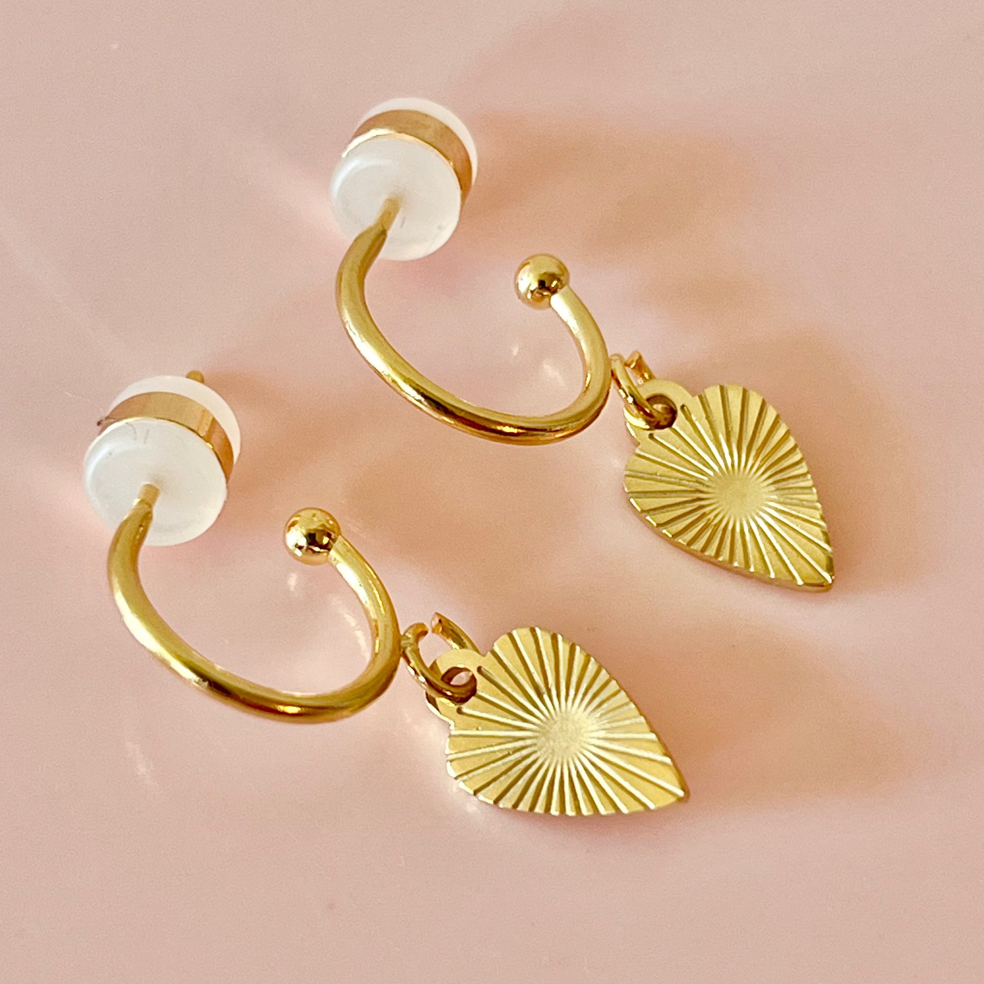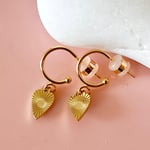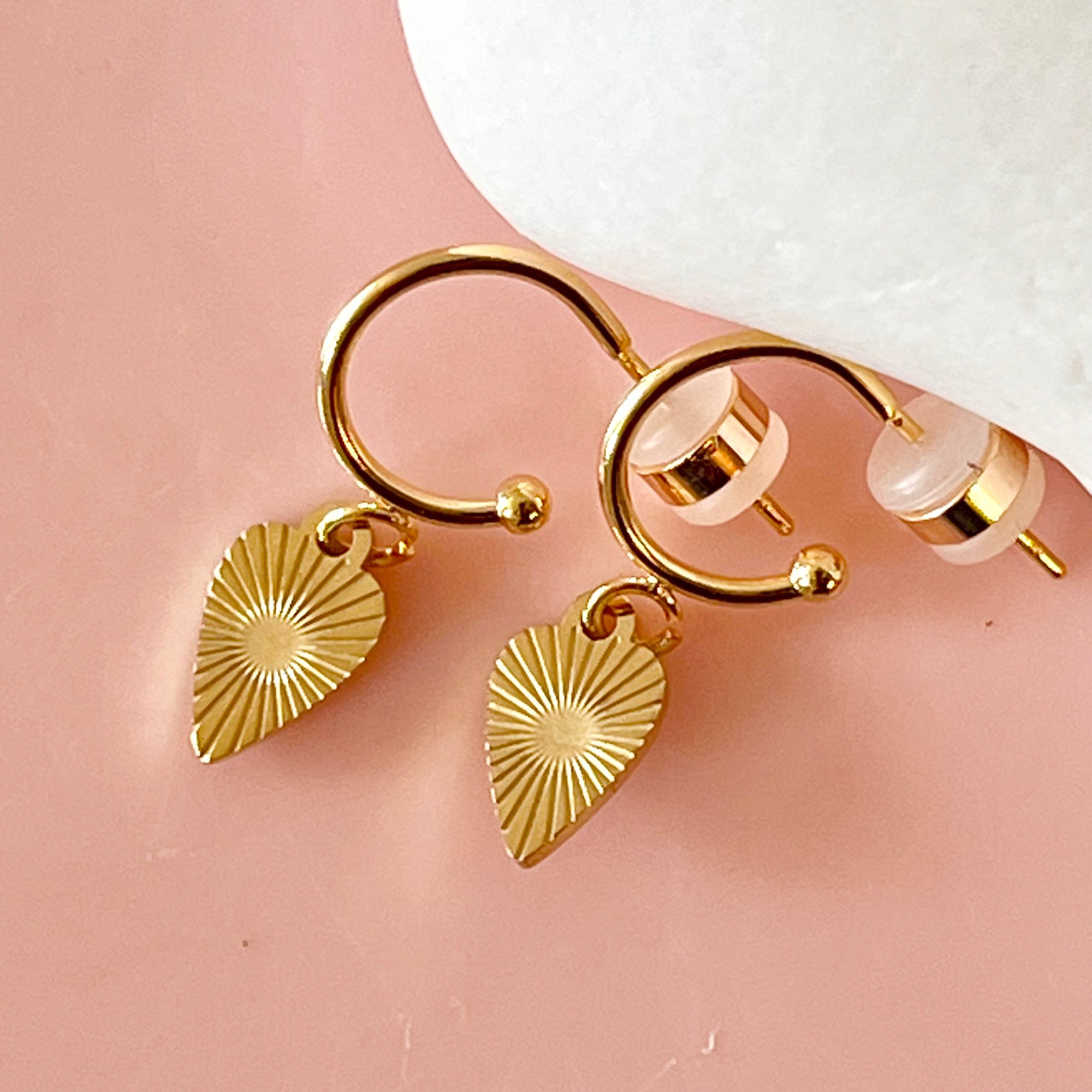 24k gold plated brass half hoops with a gold plated stainless steel heart charm. Size of hoops 11.5mm and charm 12x7mm. Comes in a cute gift bag.