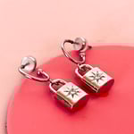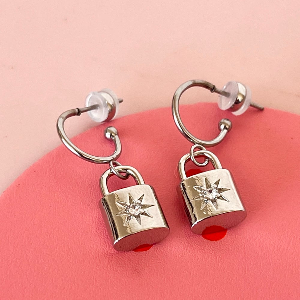 Stainless Steel half hoops with a platinum plated brass lock charm with a star. Size of hoops 11.5mm and charm 9.5x14.5mm. Comes in a cute gift bag.