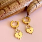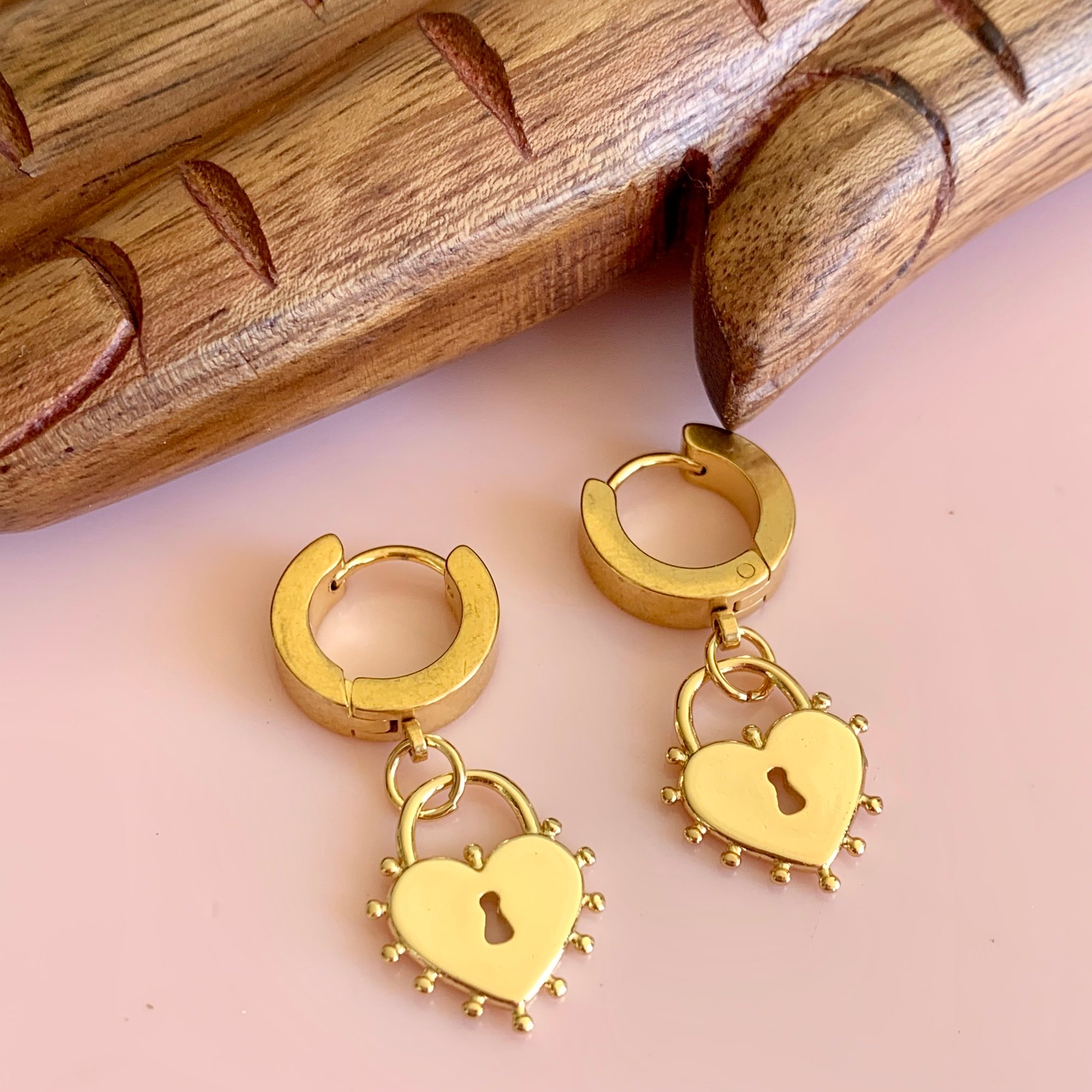 Stainless steel gold plated huggie hoops with a hanging lock charm. Size of earring 13mm. Size of charm 12x15mm. Comes in a cute gift box.