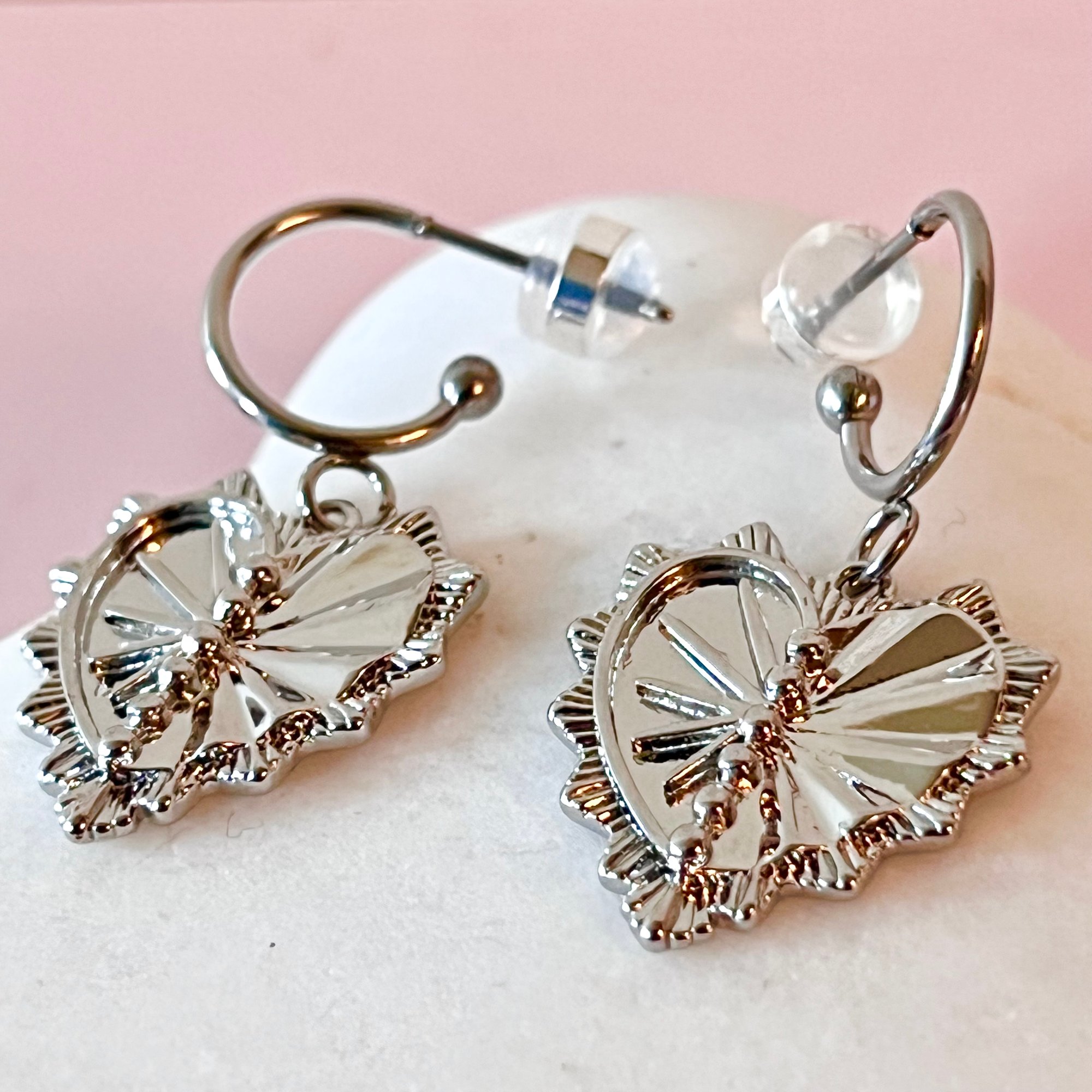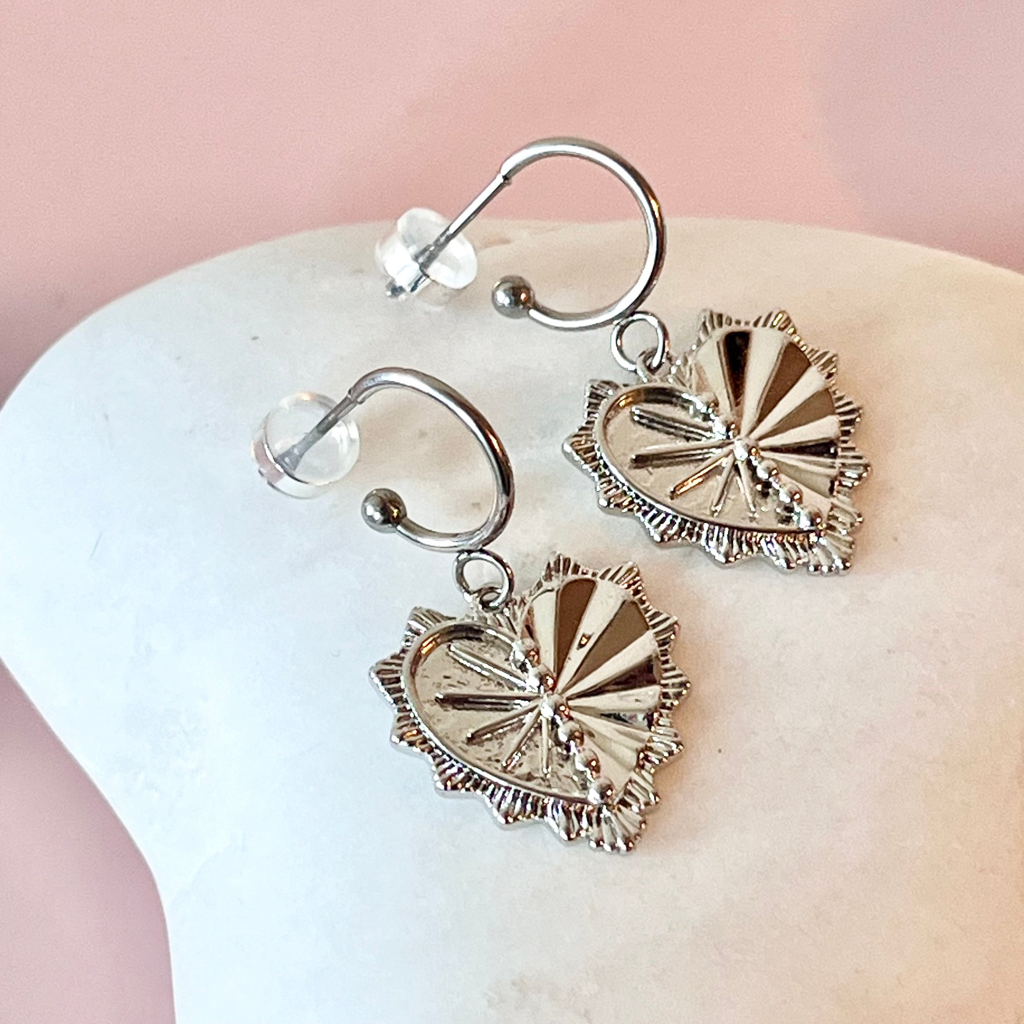 Stainless Steel half hoops with a platinum plated brass heart charm. Size of hoops 11.5mm and charm 19x18mm. Comes in a cute gift bag.