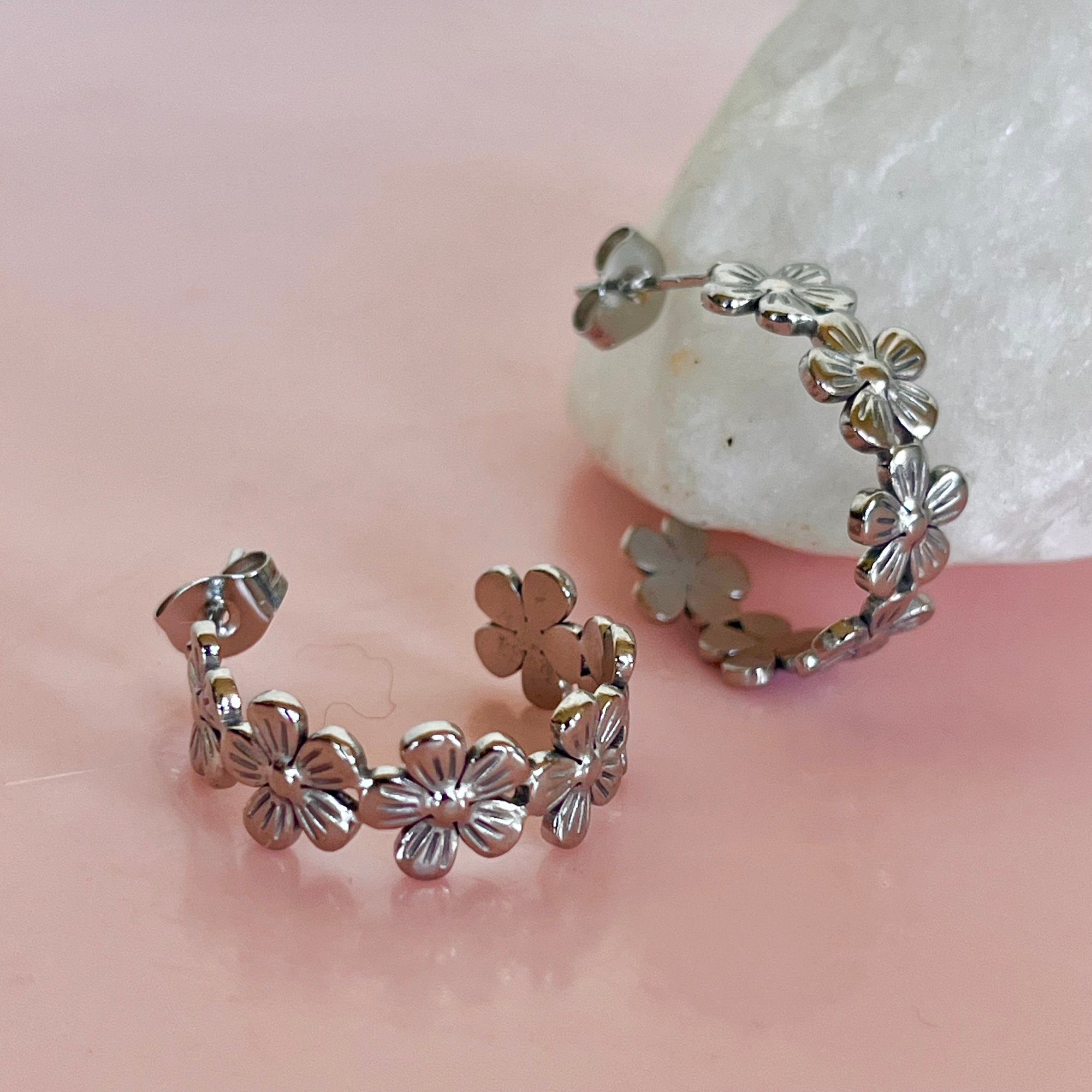 Cute stainless steel flower half hoops - 20.5x7.5mm. Comes in a cute gift bag.