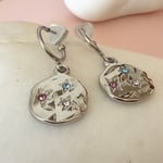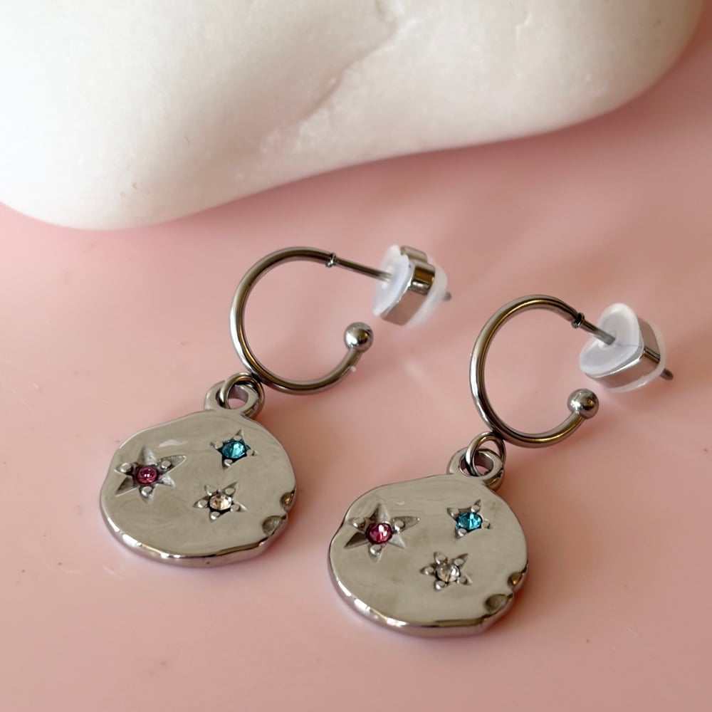 Stainless steel half hoops with cute stainless steel nugget drop with three little glass stones. Size of hoops 11.5mm and charm 18.5x15mm.