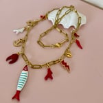 A one of a kind charm necklaces with 11 charms on a paperclip chain. The chain is gold plated stainless steel with paperclip links and measures 51cm. The charms include an enamel fish crab claw, coral, anchor and star. Comes in a cute gift box.