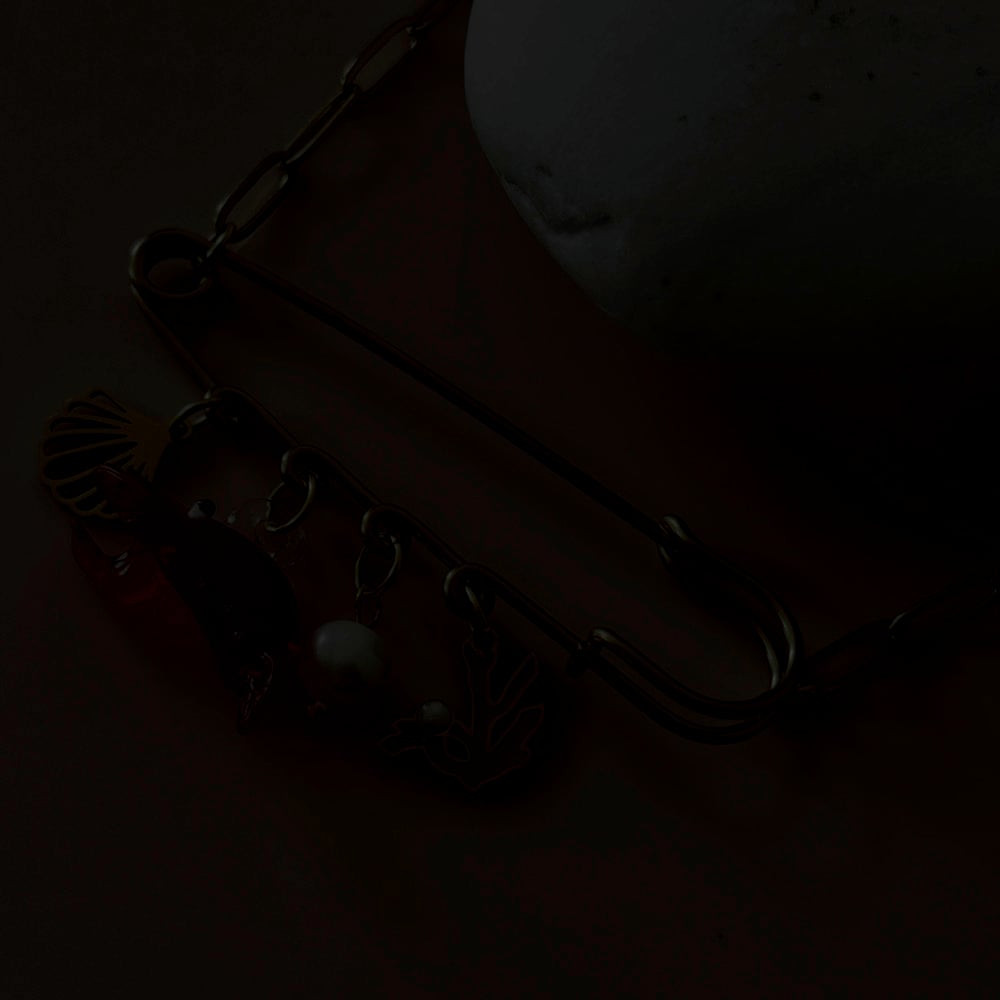 A cool new style with a chunky kilt pin and four cute sea themed charms. The pin is stainless steel plated with four charms - a gold plated shell, an enamel coral charm, a pearl and a glass lobster (32x15mm). The chain is gold plated stainless steel with paperclip links and measures 56cm. Comes in a cute gift box. Feel free to contact me if you want different charms.
