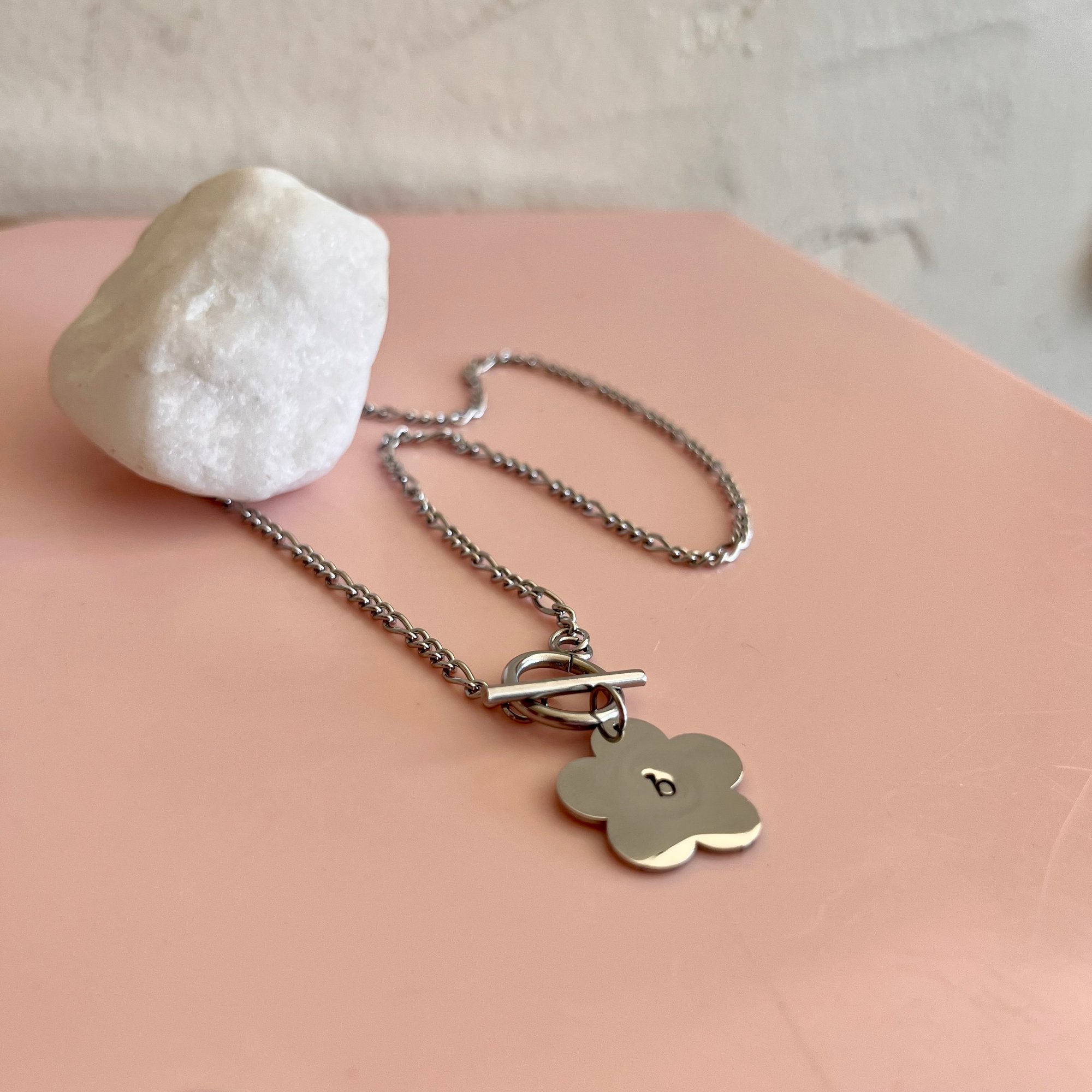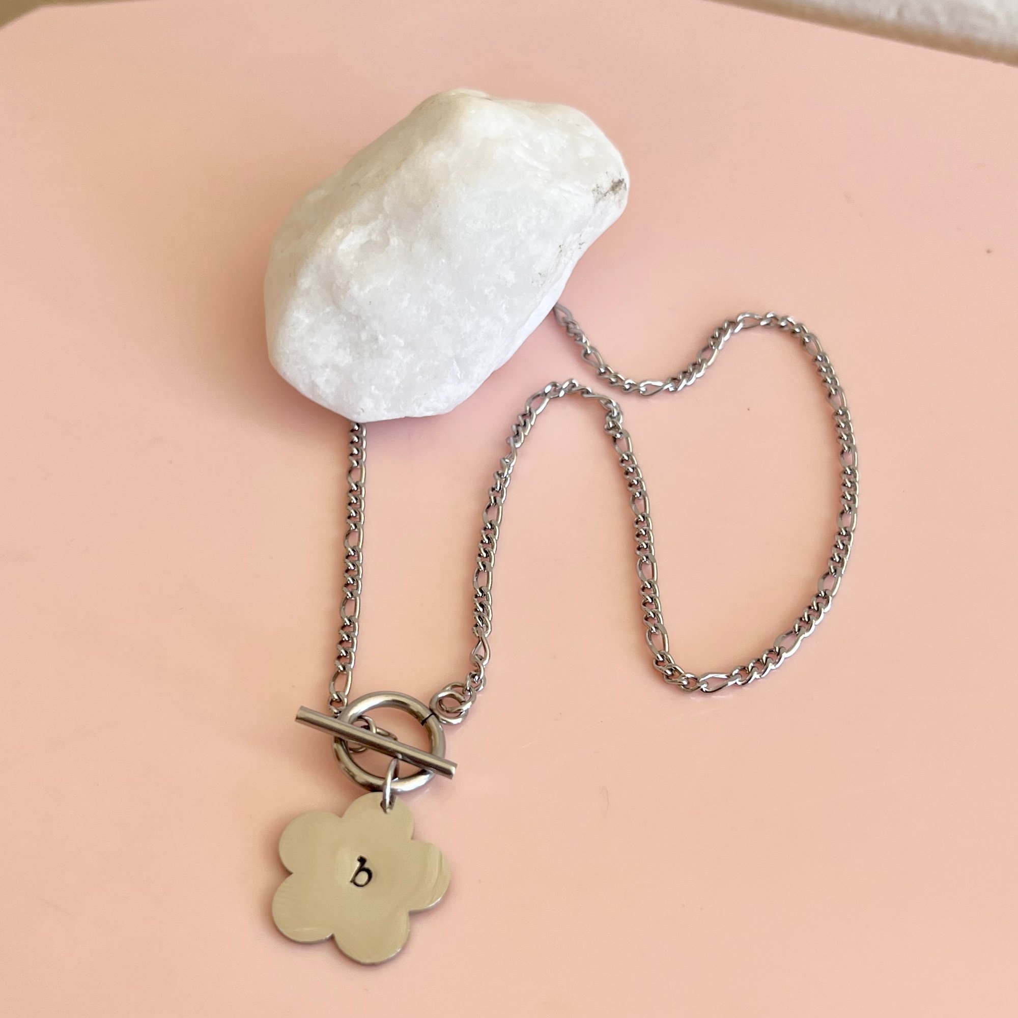 A super cure stainless steel daisy charm on a toggle clasp chain. Stainless steel chain is 3mm wide and measures 38.5cm with a toggle. Daisy charm measures 20mm. These can be personalised with a letter/letters of your choice. All letters are lowercase typewriter font. Please message me either via the website contact form or email [email protected] to let me know what letter you would like. Comes in a cute gift bag.