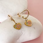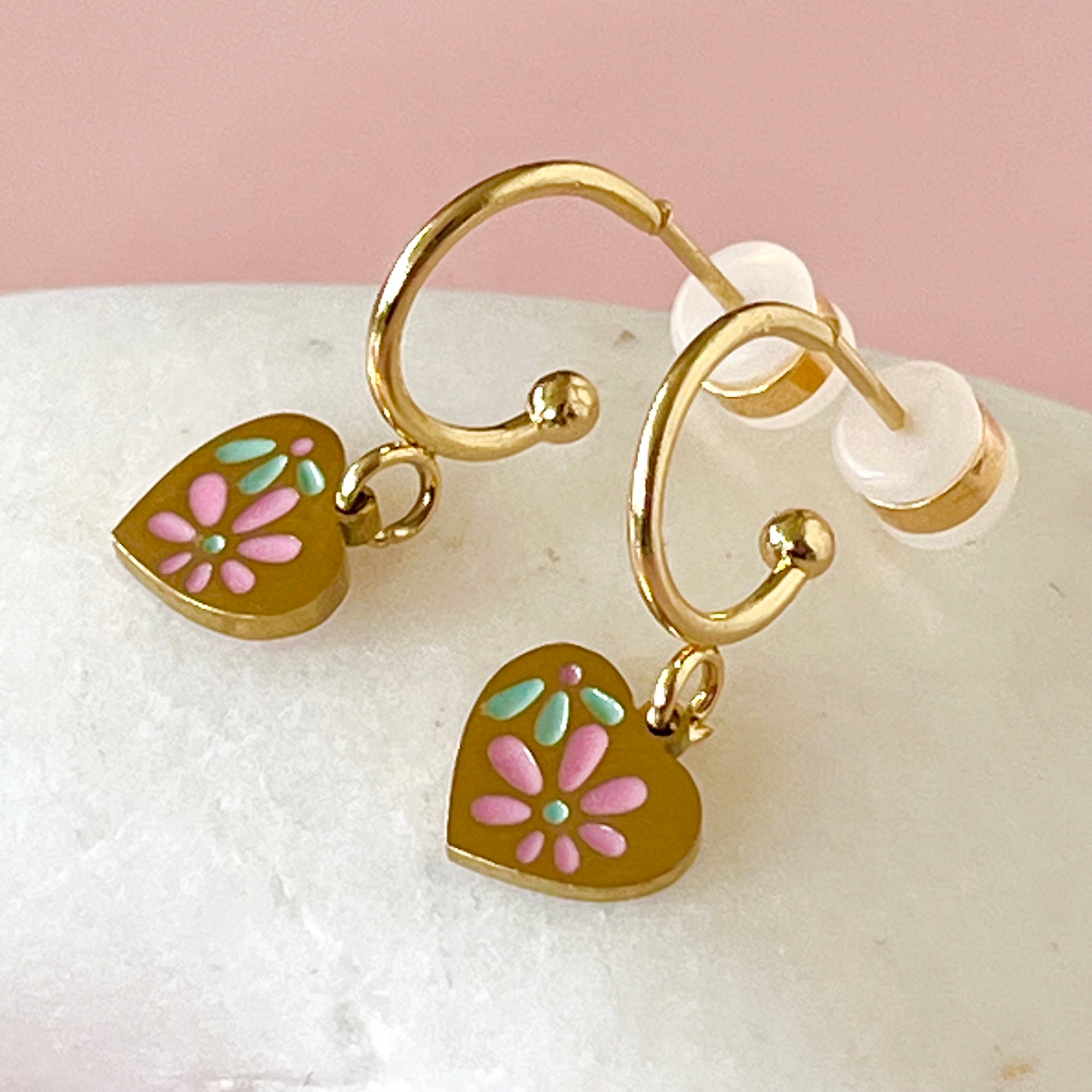 24k gold plated brass half hoops with a little 18k gold plated brass and enamel heart charm with a flower pattern. Size of hoops 11.5mm and charm 11x10mm. Comes in a cute gift bag.