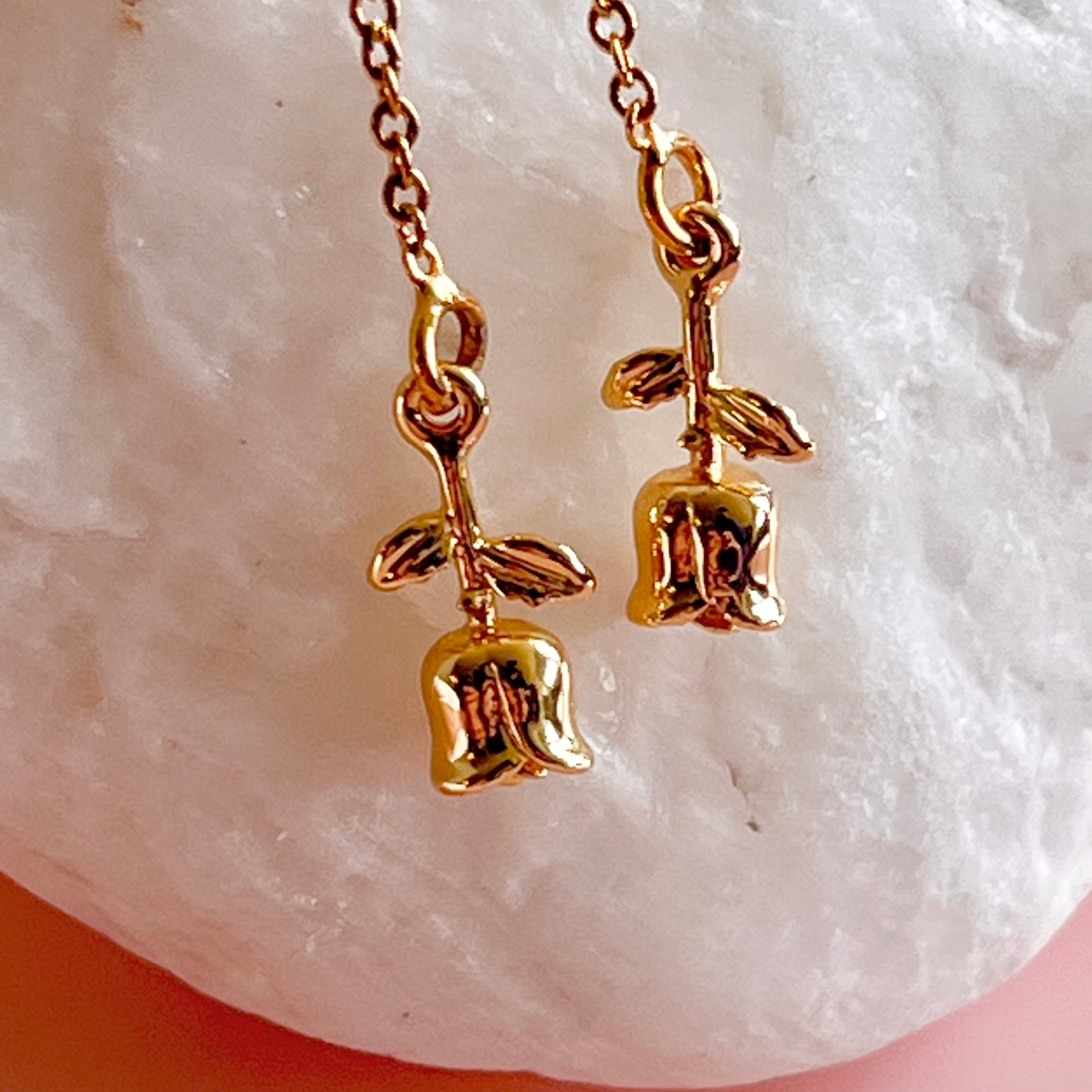 18k gold plated brass ear threads with a hanging rose charm. Size of thread 90mm. Size of charm 10x5mm.