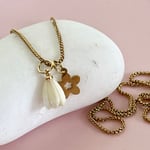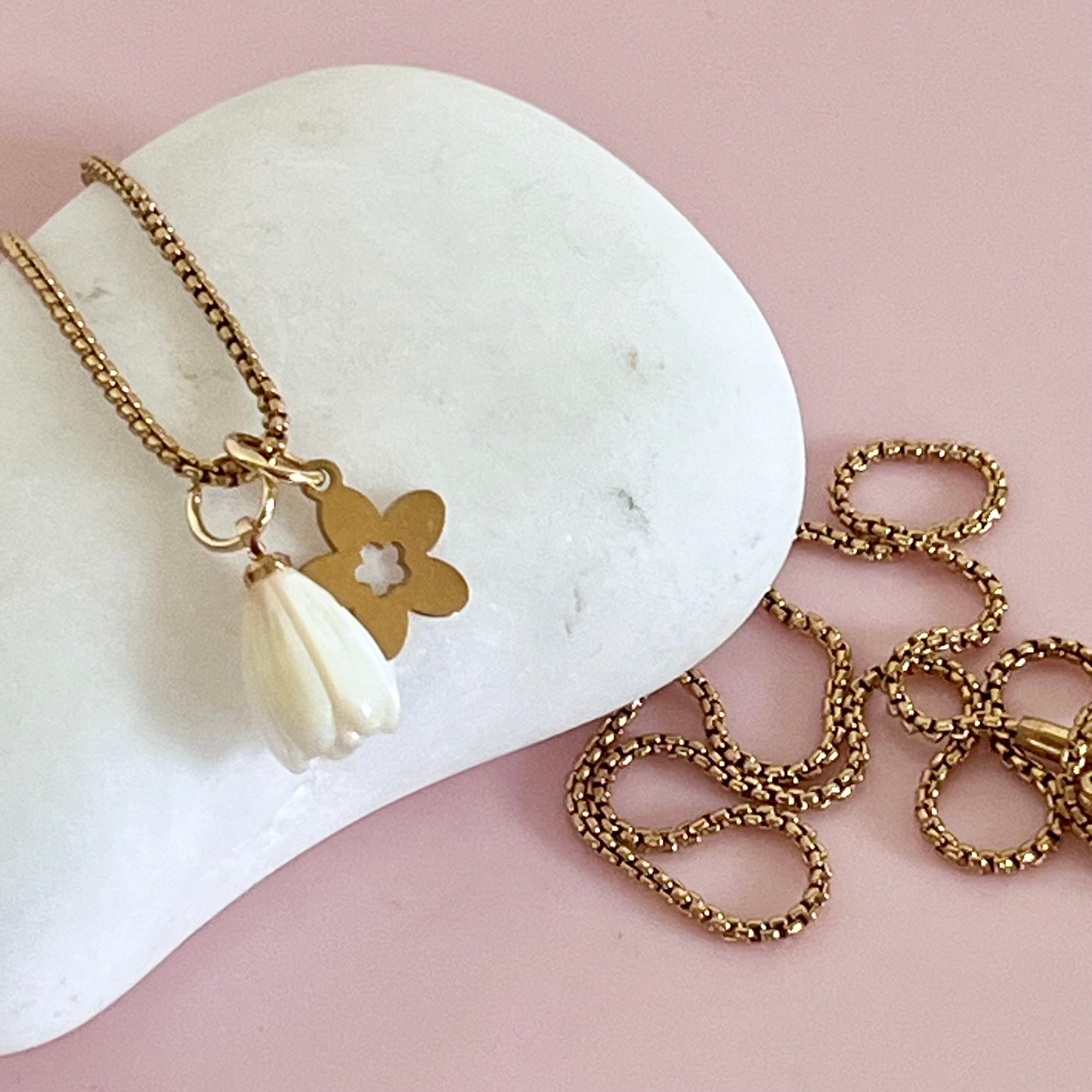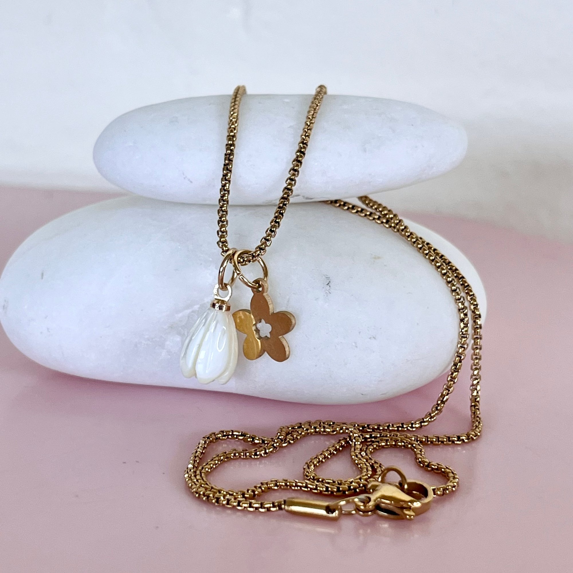 A gorgeous carved shell flower (8x11mm) and stainless steel flower charm (10mm). These come on a fine stainless steel gold plated box chain. Chain is 1.3mm wide and measures 50cm.