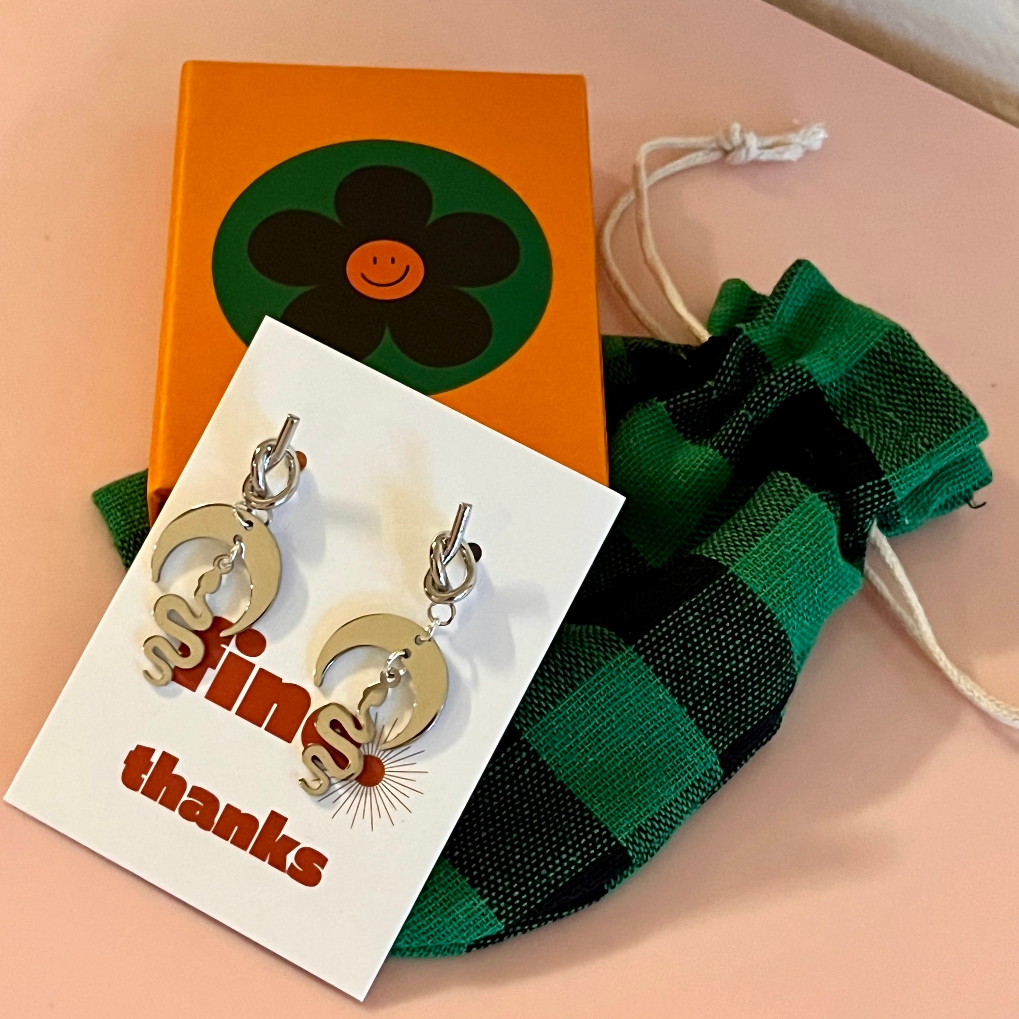 Part of the Fine Thanks range - this pair features a stainless steel moon connector (20x15mm) and a stainless steel snake (22x10mm) on a stainless steel knot ear stud. Size of drop 45mm. Comes in a cute box and gift bag.
