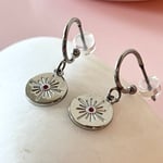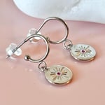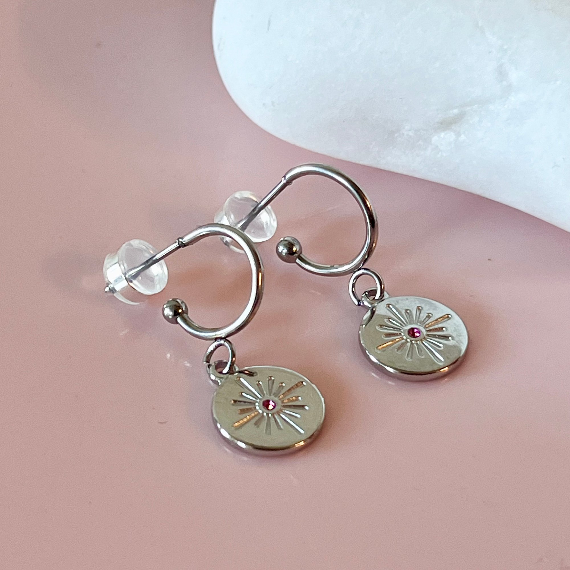 Stainless Steel half hoops with a stainless steel circle charm with a star pattern and tiny pink glass centre. Size of hoops 11.5mm and charm 11mm. Comes in a cute gift bag.