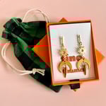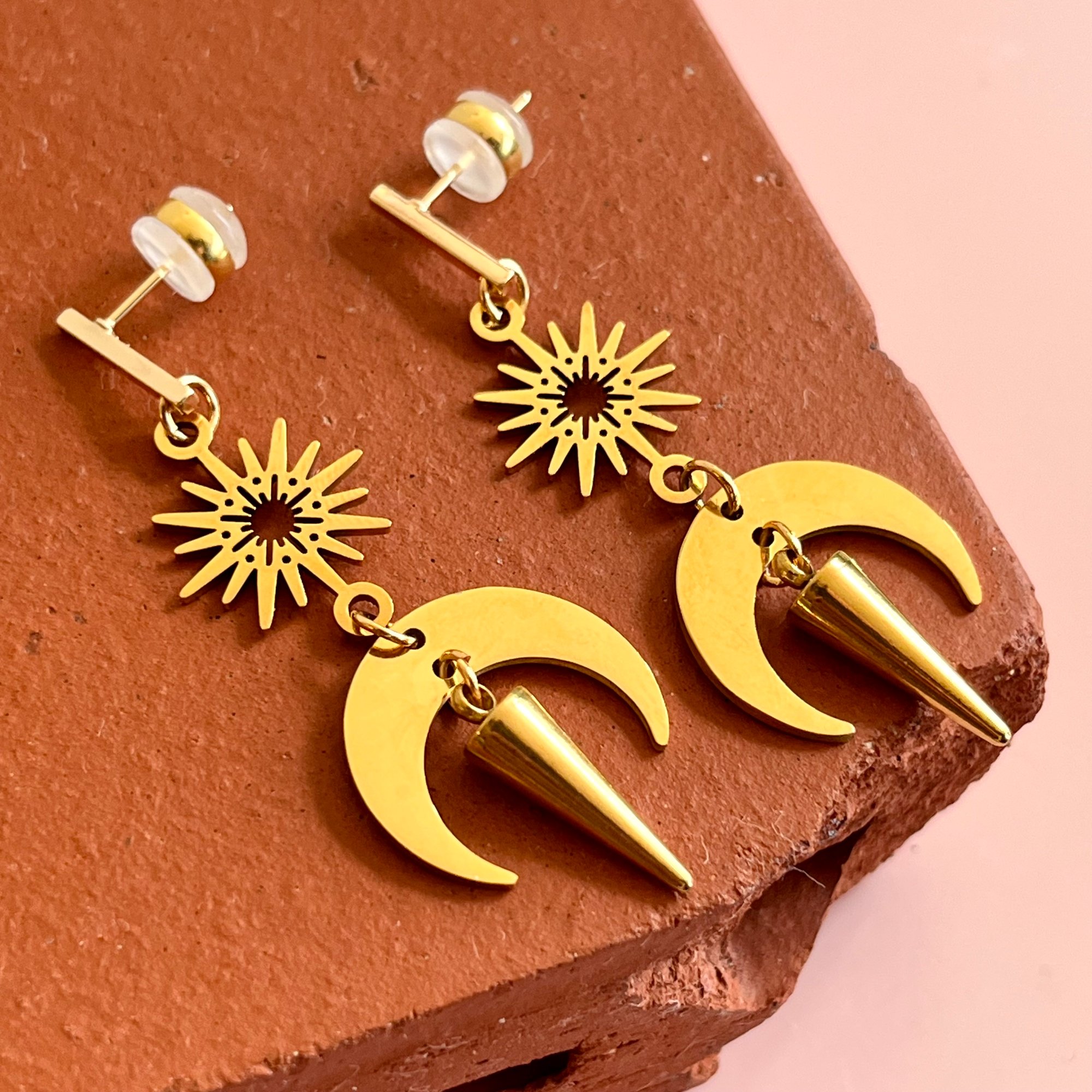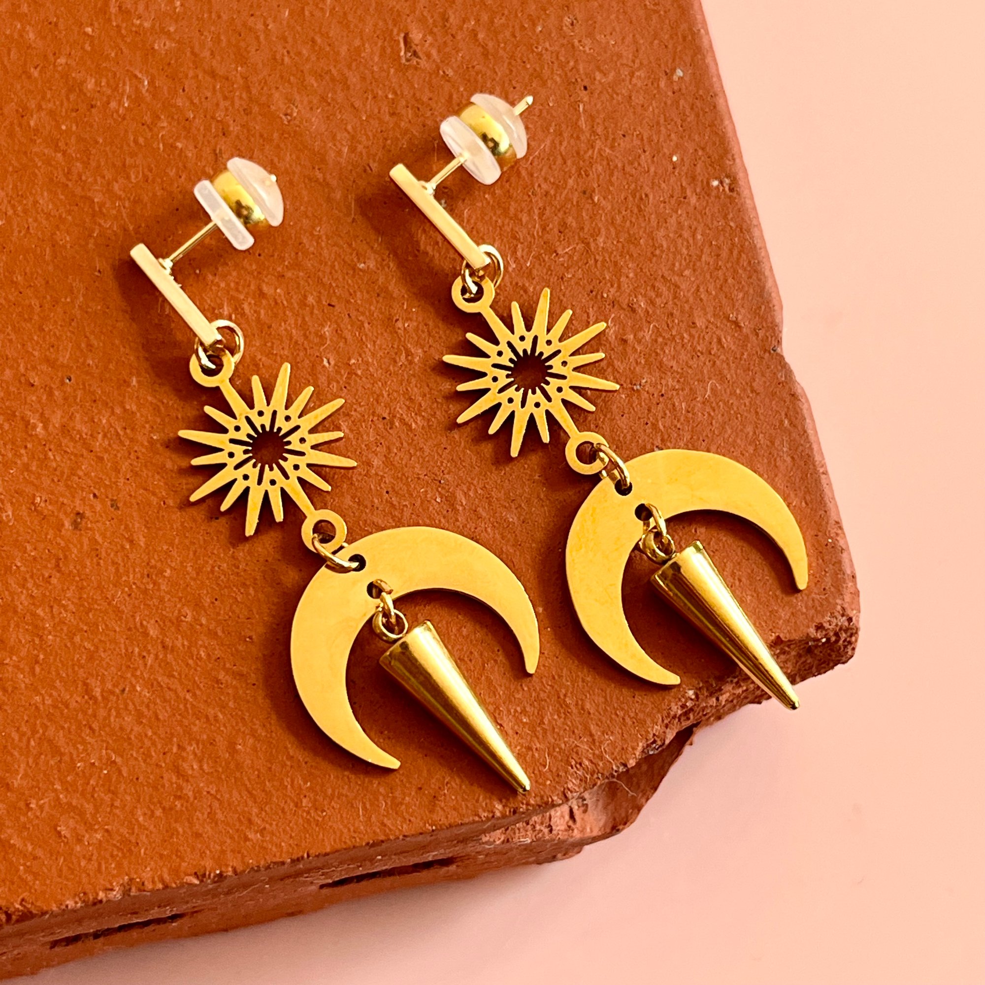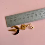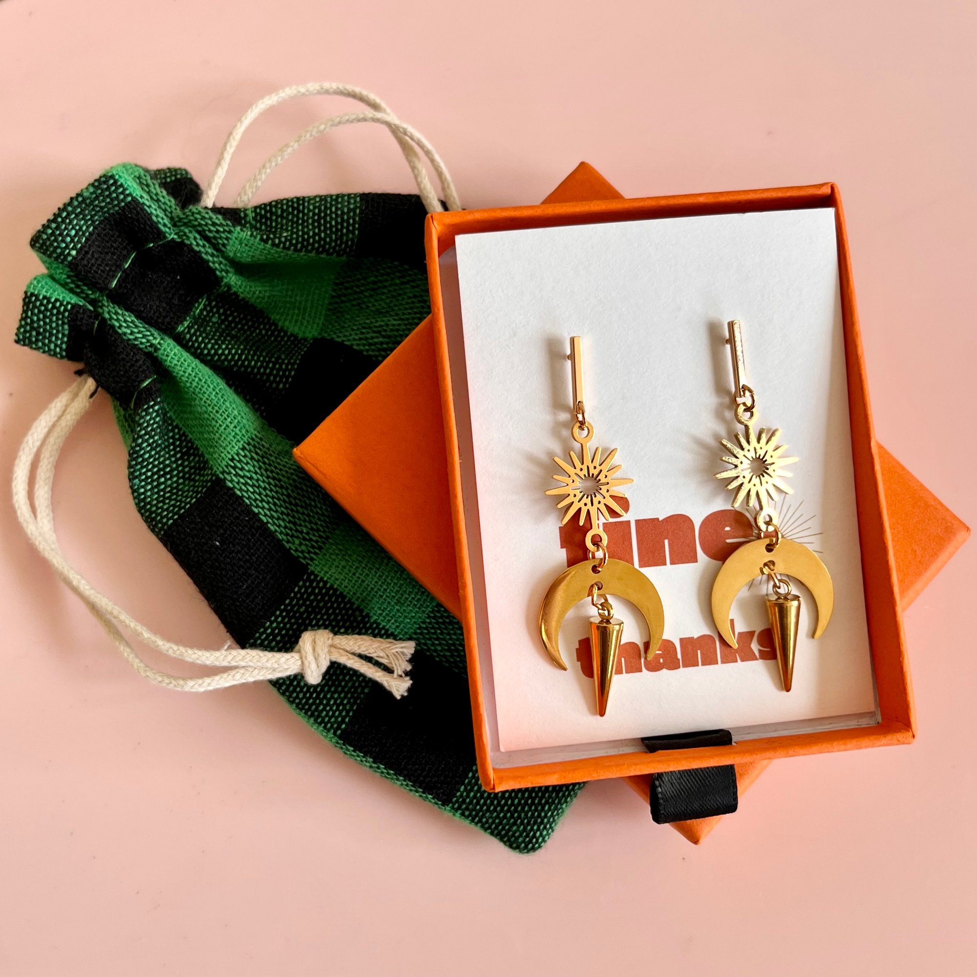 Part of the Fine Thanks range - this pair features a stainless steel plated sunburst connector, a moon connector and a spike charm on an 18k gold plated rectangular ear stud. Size of drop 55mm. Comes in a cute box and gift bag.