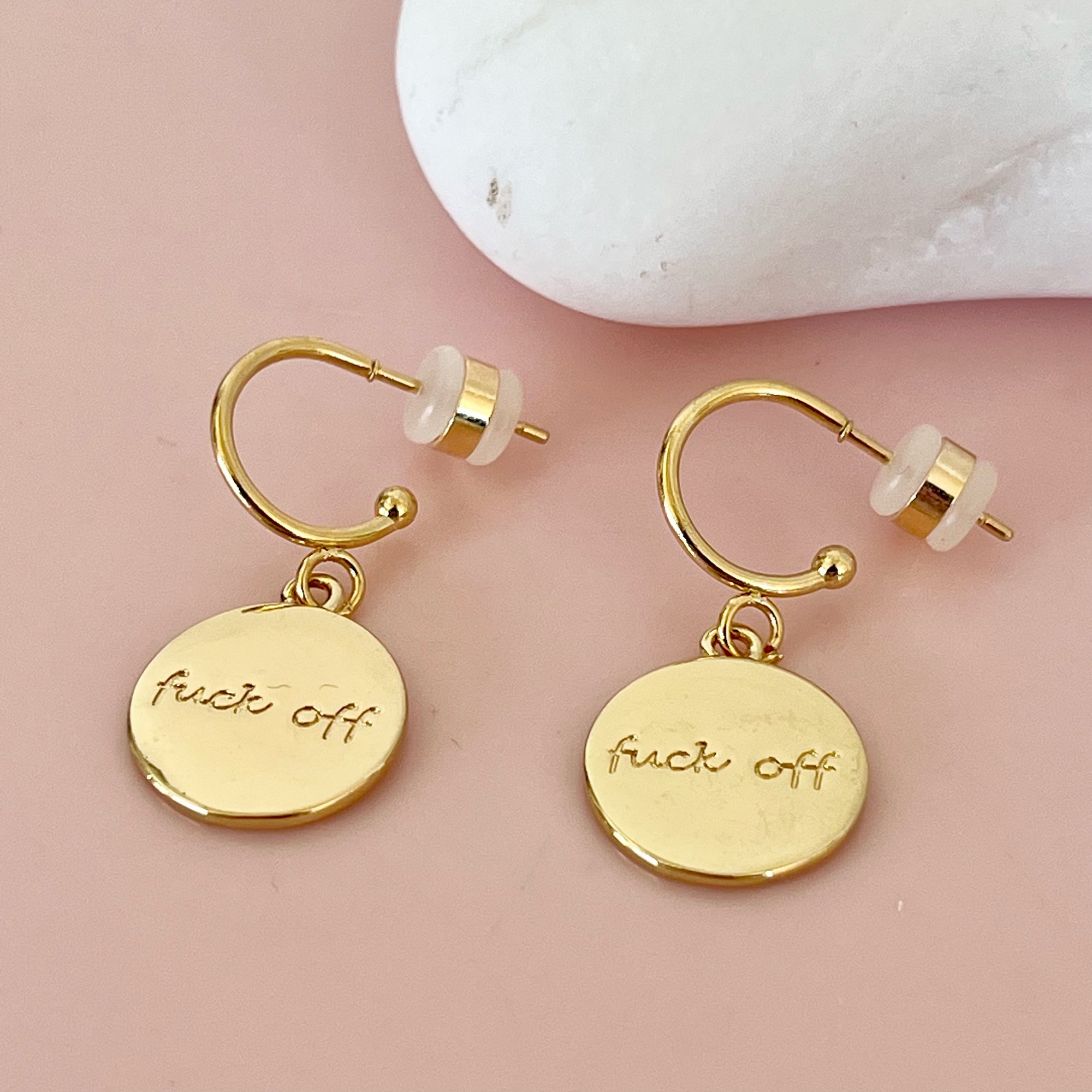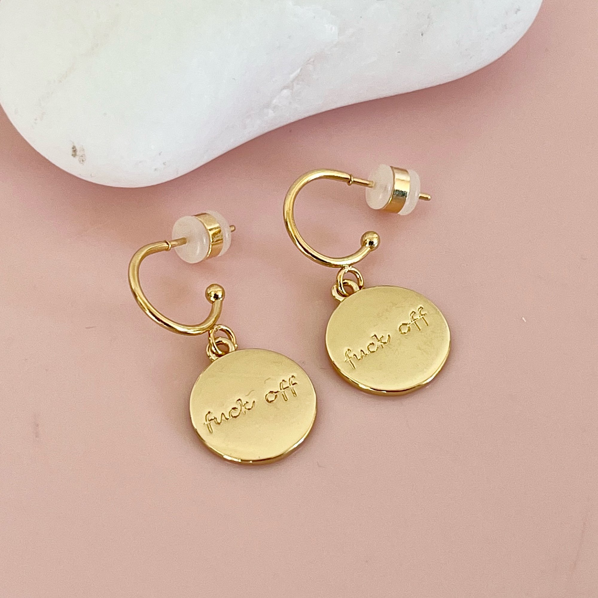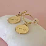 24k gold plated brass half hoops with a 18k gold plated brass charm with the word F**k O**. Size of hoops 11.5mm and charm 17x14.5mm. Comes in a cute gift bag.