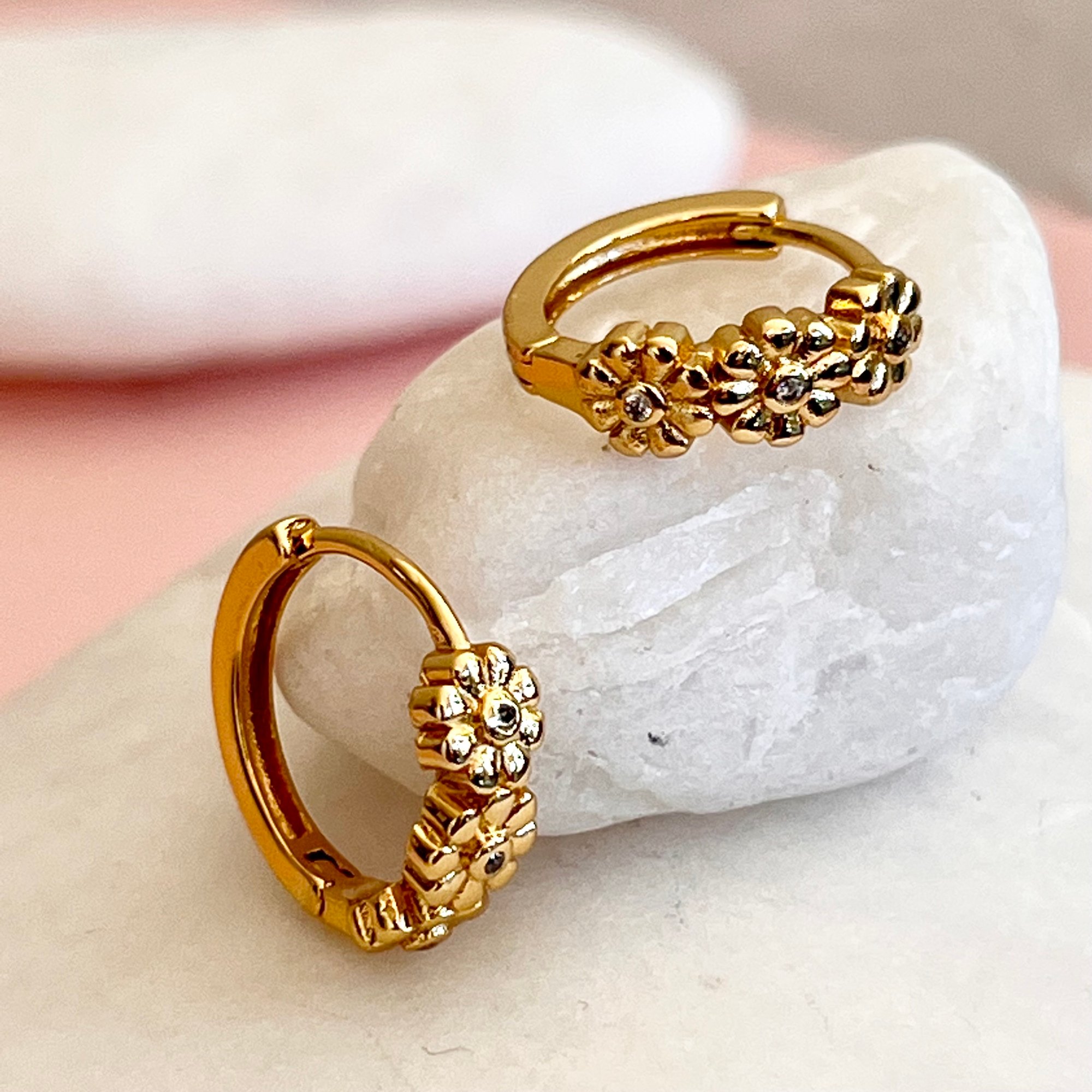 18k gold plated brass hoop earrings with three little daisies with the tiniest of cubic zirconia in the centre. Size of earring 15mm. Comes in a cute gift bag.
