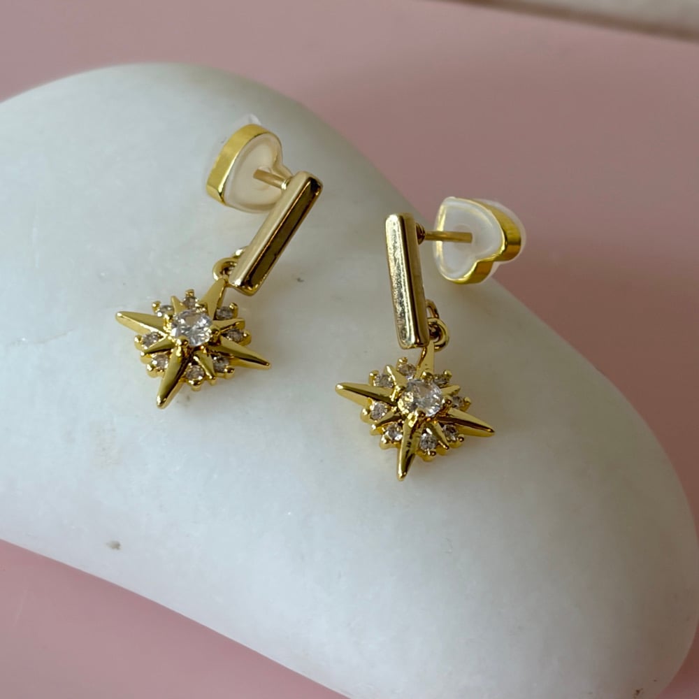 18k gold plated rectangle stud with a 18k gold plated brass star charm eitb cubic zirconia. Size of charm 14x12mm.
